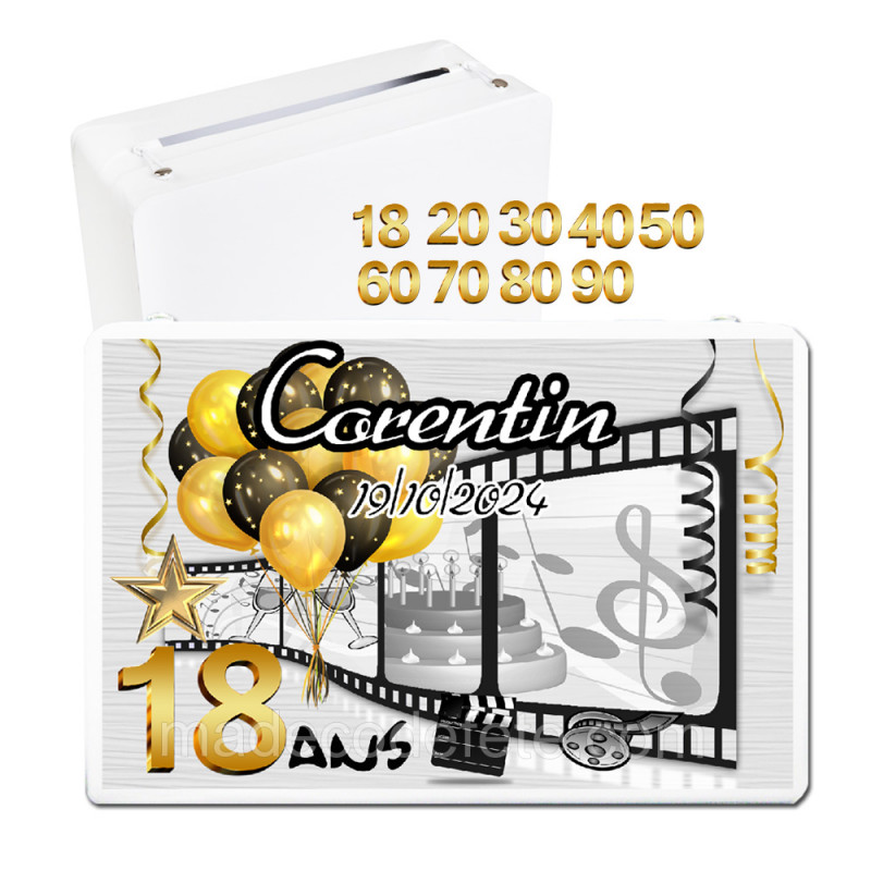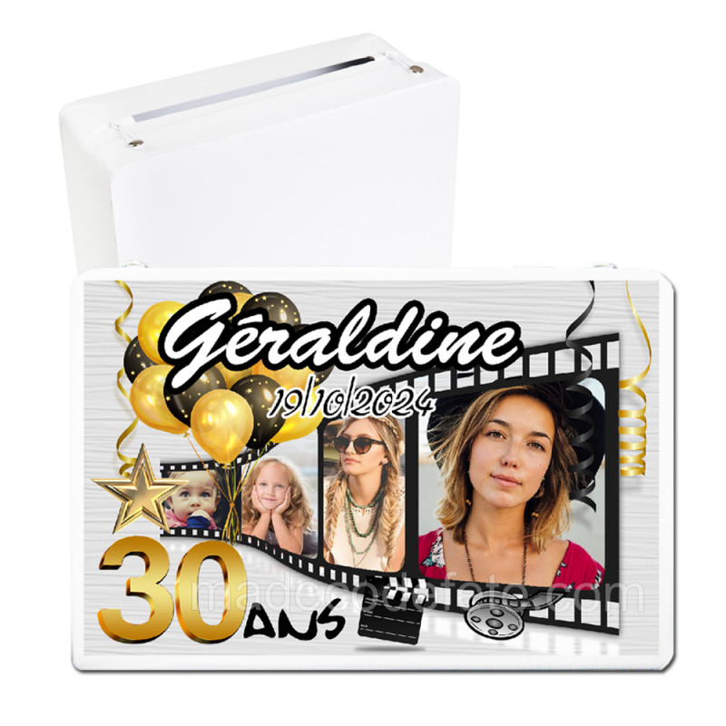 Cette tirelire pour anniversaire noir or sera parfaite sur une table à côté de votre livre d'or. Cette urne convient pour un événement d'une cinquantaine de personnes environ. Une maquette est adressée par mail pour validation ou modification.