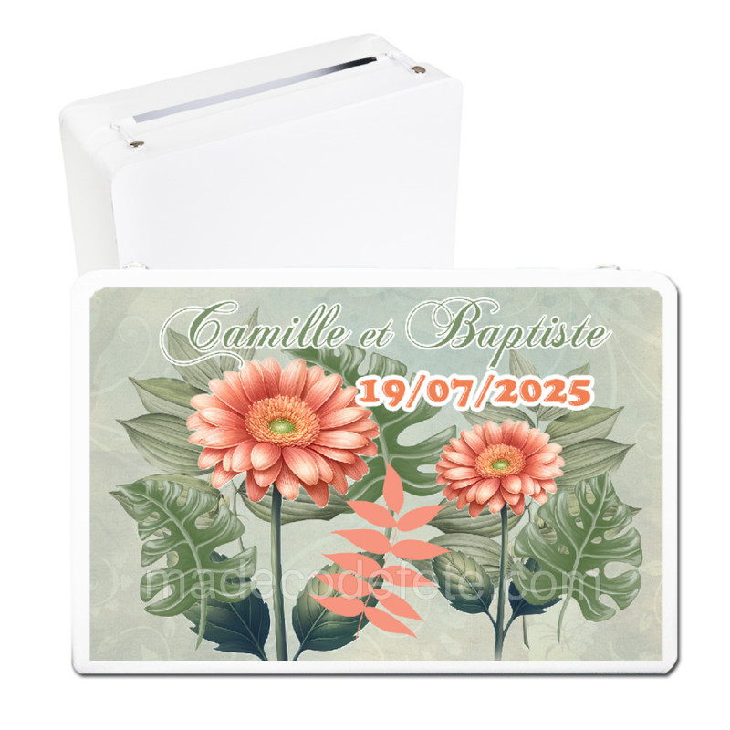 Urne pour tous événements pour une ambiance terracotta et vert sauge, motif fleurs et feuillages nature.. Vendue personnalisée avec votre texte. Matière : cartonnée. Convient pour un événement jusqu'à cinquante personnes. Dimension : 24 cm x 16 cm x 10 cm.