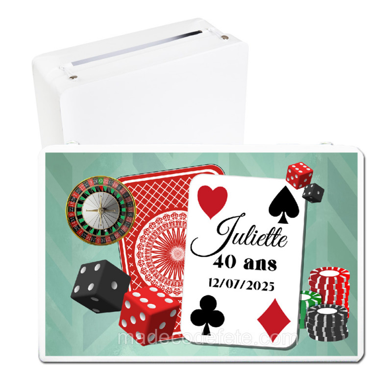 Urne pour fêtes thème déco jeux et casino, avec motif cartes à jouer, roulettes, dés... Vendue personnalisée avec votre texte. Matière : cartonnée. Convient pour un événement jusqu'à cinquante personnes. Dimension : 24 cm x 16 cm x 10 cm.