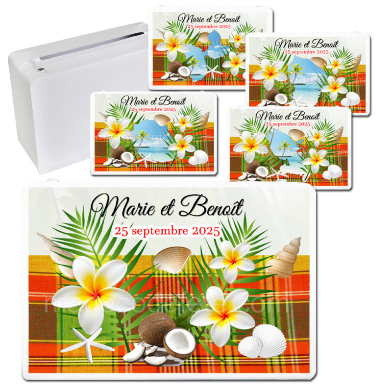 Urne madras rouge pour enveloppe mariage thème Antilles, exotique, tropical motif feuilles palmiers, fleurs tiarés, coquillages, etc... Vendue personnalisée avec votre texte. Matière : cartonnée. Convient pour un événement jusqu'à cinquante personnes. Dimension : 24 cm x 16 cm x 10 cm.